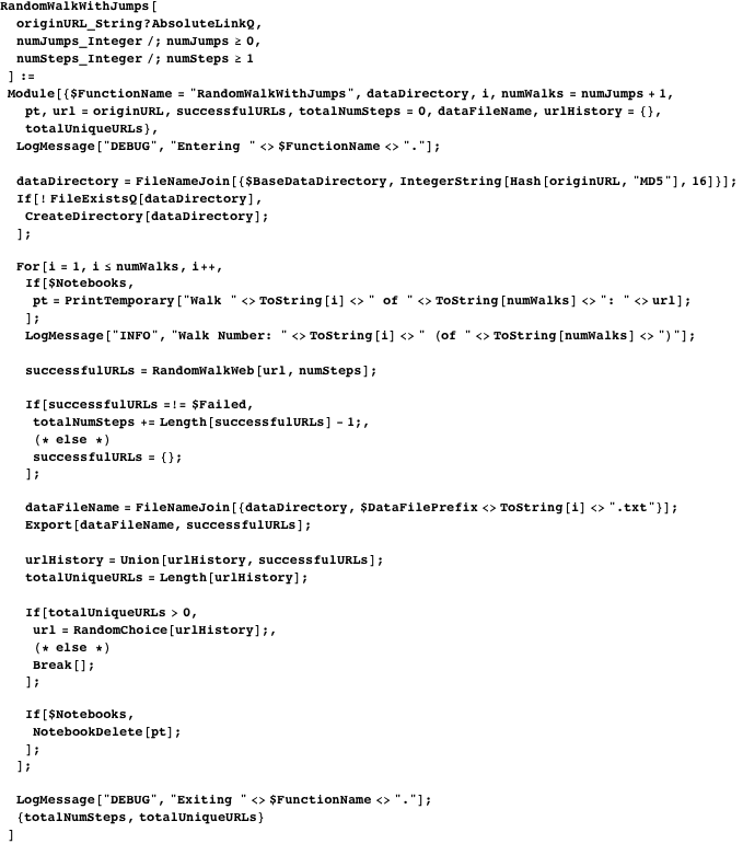 The function behaves like PerformRandomWalks (see Section 2) except that, instead of returning to the start URL, RandomWalkWithJumps “jumps” to a URL chosen at random from the walk’s history. From there, the function attempts to perform an additional