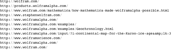 RandomWalkWeb returns a list of successfully visited URLs, displayed here as a column. If the function is evaluated from a notebook-based front end, the walk’s progress is displayed in the window status area. In the event that it reaches a URL with zero valid outgoing links, RandomWalkWeb will attempt to backtrack at most one step. The function may exit prematurely; that is, the number of steps returned is less than