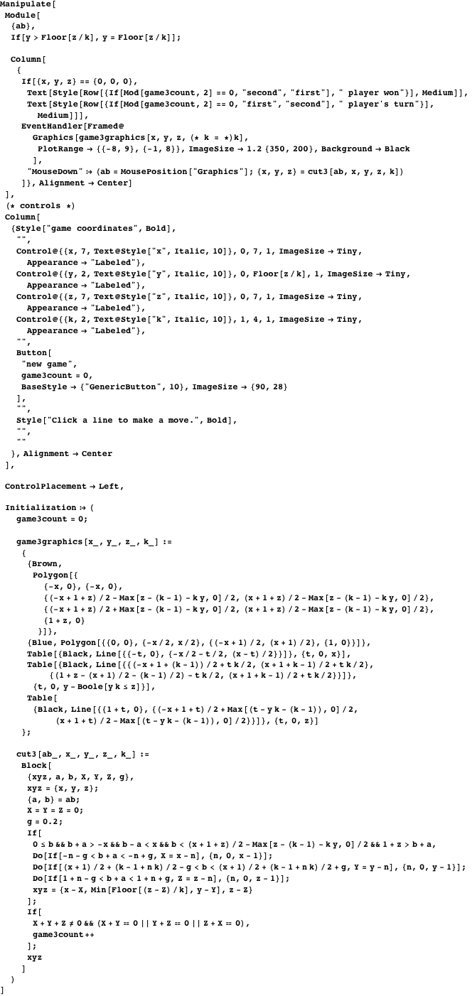 | R. Miyadera, S. Nakamura, Y. Okada, T. Ishikawa, and R. Hanafusa, “Chocolate Games,” The Mathematica Journal, 2013. dx.doi.org/doi:10.3888/tmj.15-12. | |