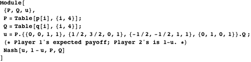 The function Nash takes as input the payoff function of player 1, the payoff function of player 2, and the actions available to players 1 and 2. It returns the entire set of Nash equilibria.