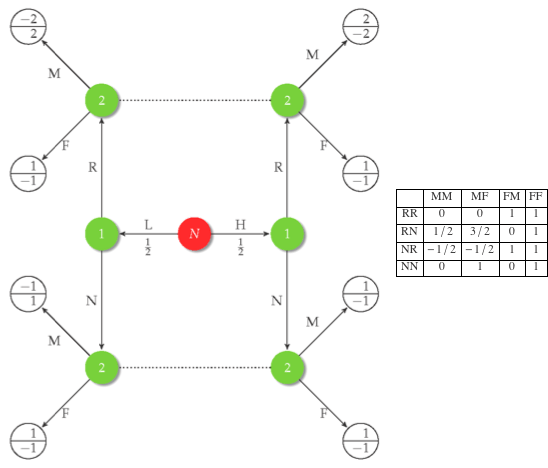 See Figure 1 for the corresponding game tree. We introduce a fictitious player, Nature, who randomly decides if the card is high or low. We depict the bimatrix representation of the game. Player 1 has four strategies: always raise (RR), always not raise (NN), raise if the card is high and not otherwise (RN), and not raise if the card is high and raise otherwise (NR). Player 2 also has four strategies: always match (MM), always fold (FF), match only if Player 1 raised (MF), and fold only if Player 1 raised (FM). For simplicity, in the bimatrix representation, we write the expected payoffs of Player 1 and omit Player 2’s payoffs (this is without loss of generality in zero-sum games).