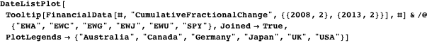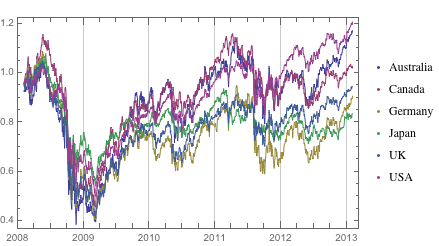 These six ETFs were included in the group of developed nations: EWA (Australia), EWC (Canada), EWG (Germany), EWJ (Japan), EWU (UK), and SPY (USA).