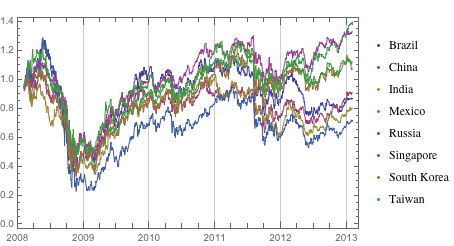Eight ETFs were included in the group of developing countries: EWZ (Brazil), FXI (China), EPI (India), EWW (Mexico), RSX (Russia), EWS (Singapore), EWY (South Korea), and EWT (Taiwan).