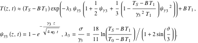 The plot shows the numerically exact temperature profiles (the colored curves) and the exact solution’s third-order approximation according to equation (48) (the dotted lines), in the range