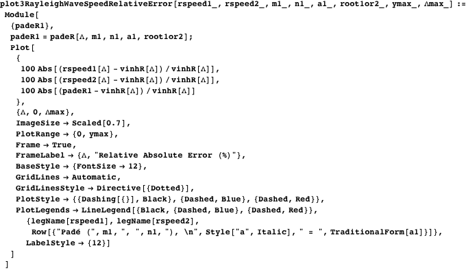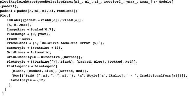 The function padeR calculates the Rayleigh wave speed based on using Padé approximants. Here mdegree is the numerator degree, ndegree is the denominator degree, avalue is the expansion point, and root1or2 is 1 or 2, so as to ensure the smallest root is chosen. (Normally root1or2 is 1, and an incorrect choice is obvious when overlaying the Rayleigh velocity estimate and the exact analytical Rayleigh wave velocity.)
