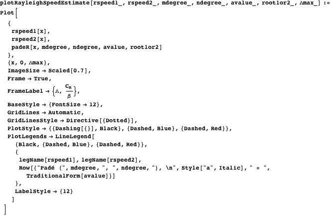 plotRayleighSpeedEstimate is a plotting function that enables comparison of the Rayleigh wave speed obtained by using two functions given in either the body of the report or in the Appendix, and also one derived from a Padé approximant (see the function legName). The input parameters are rspeed1, rspeed2 (for the two different functions), and the Padé approximant parameters.