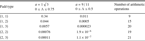 The data in Tables 1 and 2 shows that the computational effort is generally greatest for the three analytical solutions. The approximate solutions based on the Padé approximants improve their error estimates approximately tenfold as we move from Padé types