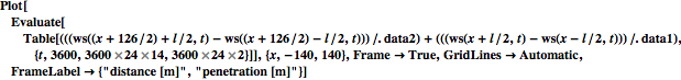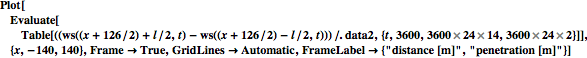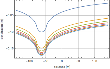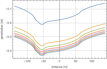 This plots the family of vertical displacements of the rig penetrated into clay and sediment.