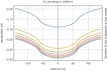 This shows the penetration of the platform, taking into account the nonuniform load distribution on the sediment, where