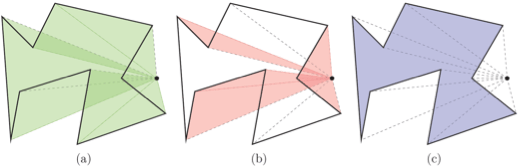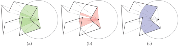 and the disc in the modified shoelace formula. A visual illustration of this modified formula is shown in Figure 4. If we consider the same example as in Figure 3 but with the addition of a disc, as depicted in Figure 4, then the orange regions (areas with negative signed area, shown in (b)) “cancel” the green regions (areas with positive signed area, shown in (a)) that are outside the polygon and “cancel” the darker regions inside the polygon, giving the desired area of intersection, shown in (c). We prove theorem 2 using induction.