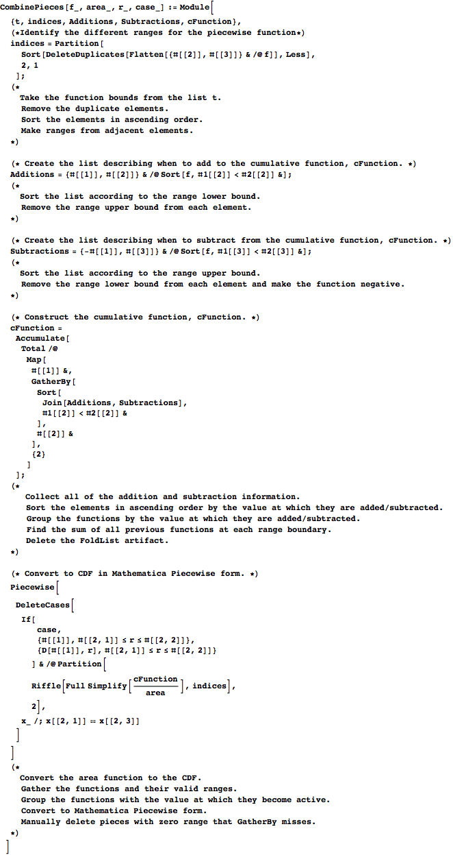 CombinePieces is responsible for simplifying a “pseudo-piecewise” function by determining the distinct ranges of the equivalent piecewise function, sorting these ranges, and finding the corresponding function for each range. This piecewise function is then converted to either the CDF or the PDF, depending on the argument case. The function takes four arguments: