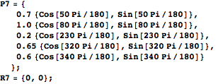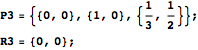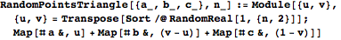 to measure off lengths on two sides of the triangle to use as weights on the vertices. RandomPointsTriangle has two arguments: T is a list of three vertices describing a triangle and n is the number of points to generate.