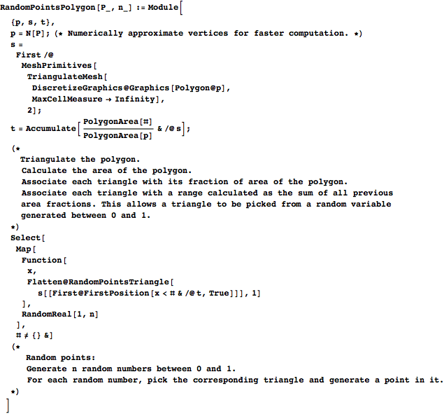 , uniformly picking a triangle, and then generating a point in that triangle. Uniformly picking a triangle means choosing each triangle with probability such that the points generated are uniform for the whole polygon; this means that the probability of picking a triangle