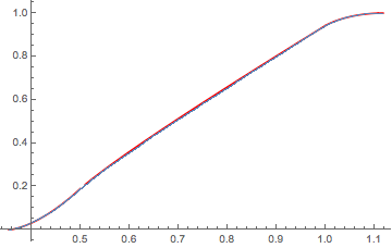 The analytical result for the CDF (red) is compared with the result obtained from simulations (blue).