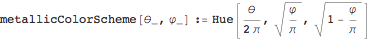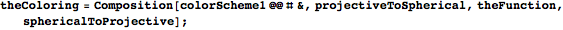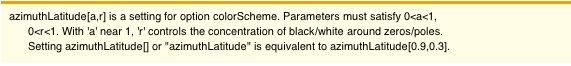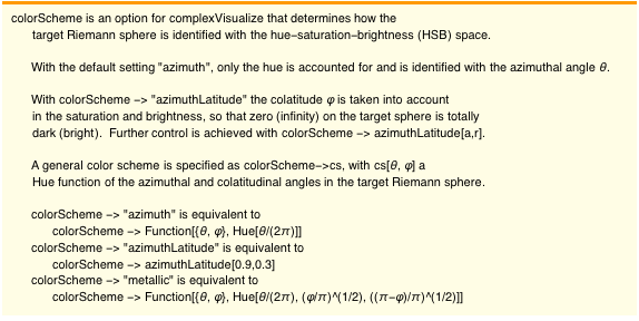 With the colorScheme option it is possible to implement any color rule with an appropriate function between the HSB space and the Riemann sphere. This allows the program to generalize color schemes that have appeared in the literature in the planar case.