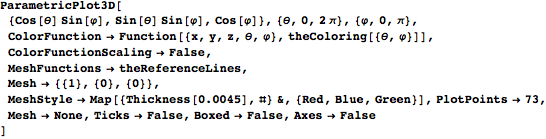 The program also draws the preimage of the grid on the image sphere determined by its longitudes and latitudes. Furthermore, the preimages of three special geodesics are emphasized: the preimages of the equator are red, and the meridians corresponding to the intersections of the