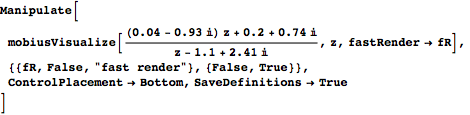 You can experiment with further applications. Some ideas for classroom demonstrations are: (a) a sequential rendering of the Taylor expansion of a transcendental function in increasing degree; (b) exploration of the subgroups of Möbius transformations; and (c) exploration of different color schemes.