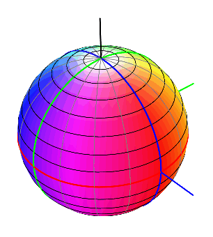 planes with the image sphere are blue and green, respectively. These correspond to the unit circle and the real and imaginary axes on the image sphere.