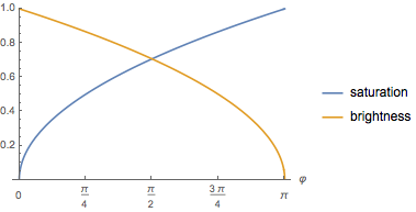 In the color schemes that we explicitly consider here, the value of the hue is directly related to the argument of the image of the function, while the saturation and brightness are related to the modulus of the image values. Since a complex-valued function is determined by the argument and modulus of its image, the color scheme gives a complete global picture of the function.