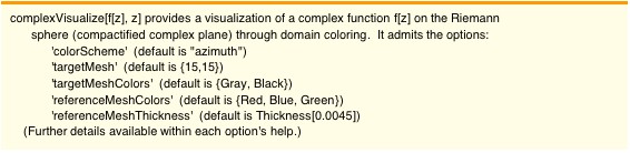 on the Riemann sphere. The two main commands defined in the package are complexVisualize and mobiusVisualize. The former renders the domain coloring of a generic
