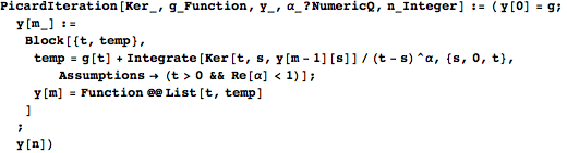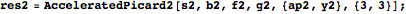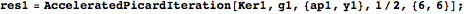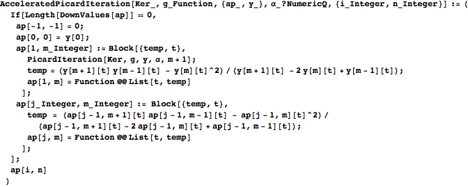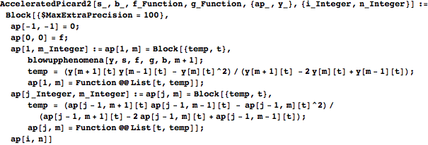 method accelerates the convergence [6], but accelerators like this one are highly unstable numerically. One has to pay careful attention (in particular for division by zero) when working with such accelerators; it is important to use high precision. The following is a program to accelerate Picard’s iteration using the already developed PicardIteration program.