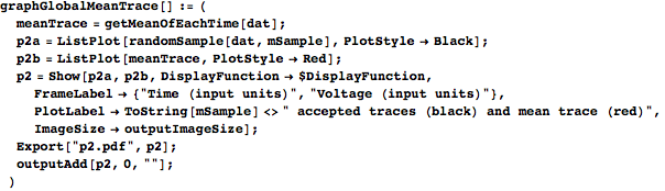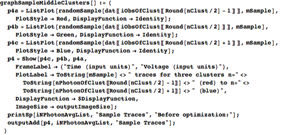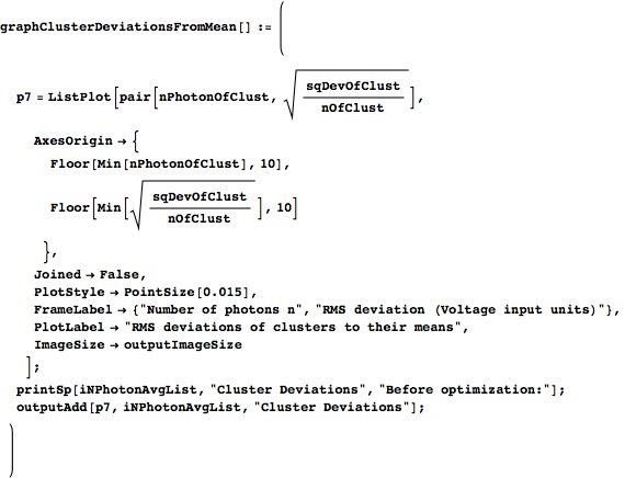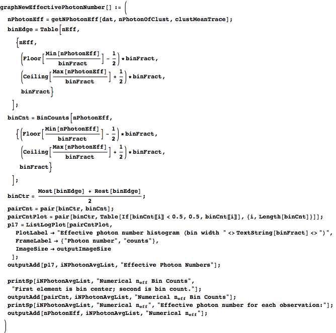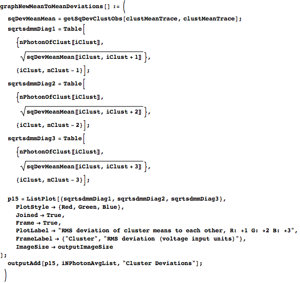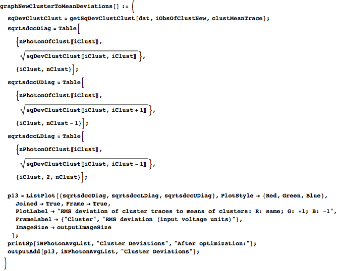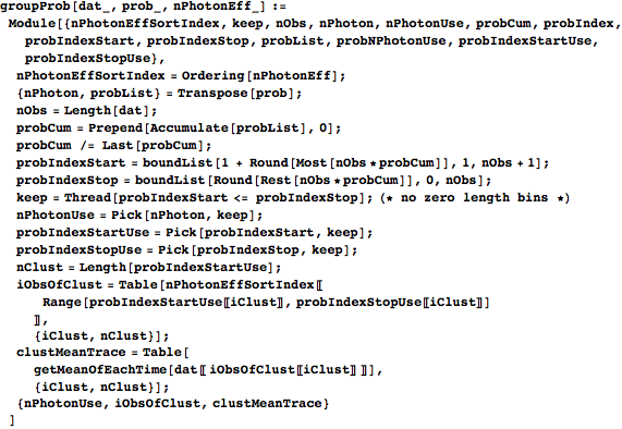 gives the index where it should stop. Both indices are inclusive, which is why probIndexStart is offset by one from probIndexStop. (boundList ensures that the starting and stopping indices stay within the confines of the number of observations available to group.) keep weeds out the zero-length bins, and we use it to reduce nPhoton, probIndexStart, and probIndexStop down to only the nontrivial clusters. We then form iObsOfClust by finding the range of sorted effective photon numbers that each cluster should encompass and then using nPhotonEffSortIndex to find the observation numbers to which that range corresponds. clustMeanTrace is formed by taking the waveforms in dat of each cluster in iObsOfClust and averaging them. We then return nPhotonUse (the photon numbers of the nonempty clusters), iObsOfClust, and clustMeanTrace.