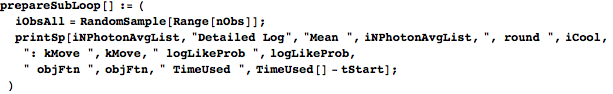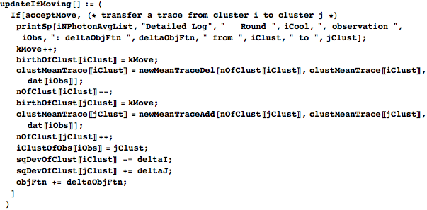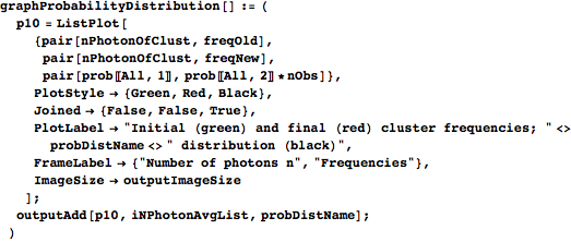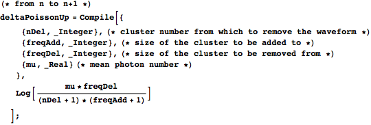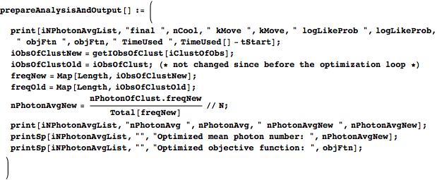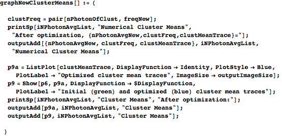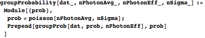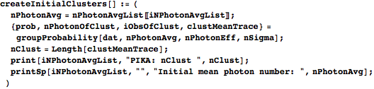 groupProbability takes the data, the hypothesized mean photon number for the current round, and the effective-photon-number ordering of the data, and returns a list of four things: the Poisson probability distribution (ordered pairs of photon numbers and probabilities), a list of photon numbers for the clustering it creates, a list of lists of constituent waveforms’ indices for the clusters (iObsOfClust), and a list containing the average waveform in each cluster. groupProbability finds the photon number/value pairs for the Poisson distribution with the given mean photon number and then calls groupProb to organize the clusters.