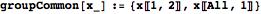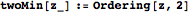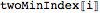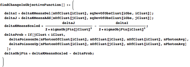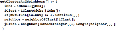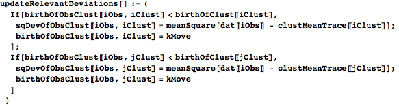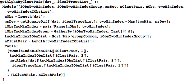 is a pair of indices giving the two cluster means with the lowest mean square deviations to observation i (i.e. a pair of indices giving the two columns with the smallest elements in row i of msDev). iObsTwoMinIndex pairs the relevant observation index with each pair in twoMinIndex. In the next line, the GatherBy groups the elements of iObsTwoMinIndex by their lowest-deviation index pairs, so that each element of iObsTwoMinIndexGroup is a list of elements of iObsTwoMinIndex that all have the same pair of nearest cluster means. Mapping groupCommon onto each of these lists in iObsTwoMinIndexGroup converts them into a more useful form; each element of twoMinIndexIObsList is now a list of length two, with the first entry being a pair of nearest-mean indices and the second being a list of observation indices whose nearest two means correspond to the pair in the first entry. The output is a list with an entry for each distinct ordered pair of nearest means. Each entry contains a pair of nearest-mean indices, a list of observations whose nearest means are those two, and a list giving the alpha value for each of those observations.