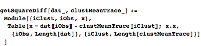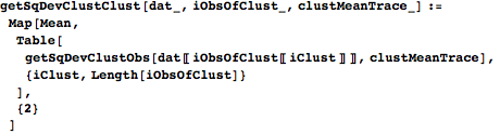 getSqDevClustObs takes a list of observation traces and a list of cluster mean traces and returns a table whose element in position