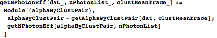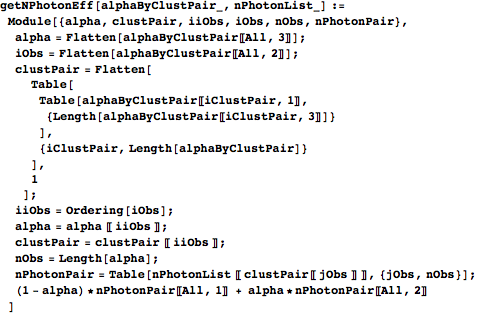 The two-argument getNPhotonEff takes the formatted list of triples alphaByClustPair and a list of cluster photon numbers and determines the effective photon number of each observation. alpha is a list of alpha values for the observations, iObs is a list of observation indices corresponding to those alpha values, and clustPair is a list of nearest-mean-index pairs for those observations. alpha and clustPair are in the same order as iObs, but we want them in the same order as the waveforms from the original dataset, so we reorder them with iiObs. nPhotonPair takes the cluster indices in clustPair and converts them to the actual photon numbers associated with those clusters. The output is a list specifying the effective photon number for each observation, derived from a linear interpolation between the closest (