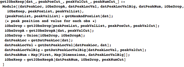 getIObsKeepA takes the list of waveforms rejected because of misplaced peaks and too-large endpoints and combines that with the information on each waveform’s number of maxima to return a list of the indices of all of the waveforms that should be rejected due to background radiation.