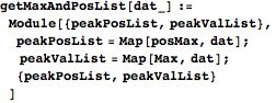 getMaxAndPosList returns two lists, the first giving the position of each waveform’s maximum and the second giving the maxima themselves.