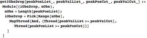 If background rejection is enabled, getIObsKeep returns the indices of the observations that should stay in the dataset, based on the preset parameters for rejection. peakPosList and peakValList are lists specifying the position and value of the maximum in each waveform in dat. getIObsDrop returns the indices of the waveforms that should be removed because their peak positions and values exceed their respective cutoff values, and getIObsDropA lists those whose endpoints are greater than the value cutoff, indicating that the sensor was registering a background photon at the beginning or end of the pulse. These two lists to remove are combined into iObsDrop. Each element of datPeakLoc lists the positions of the local maxima of a waveform in dat, datPeakLocVal pairs each of those positions with the waveform’s value there, and datPeakLocValBig reduces datPeakLocVal to the maxima that exceed the peak value cutoff. datPeakNum gives the number of maxima in each waveform, and getIObsKeepA returns the indices that should stay in the dataset (i.e. those that are not in iObsDrop and that have fewer maxima than peakNumCut).