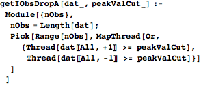 getIObsDropA returns the indices of the waveforms whose endpoints have values greater than the cutoff, indicating that a background photon may have registered with the sensor at the beginning or end of the pulse.