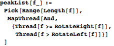 peakList finds the local maxima of a list by comparing each element to the ones before and after it.