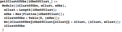 getIClustOfObs creates a table with an entry for each observation and then iterates through the clusters. In the table, it assigns the contents of each cluster to the appropriate cluster number.