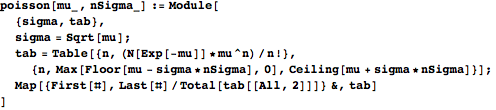 poisson generates about nSigma standard deviations of a Poisson distribution on either side of the given mean. The output is a list of ordered pairs of photon numbers and associated values of the Poisson probability mass function. The output is normalized so that it sums to one.