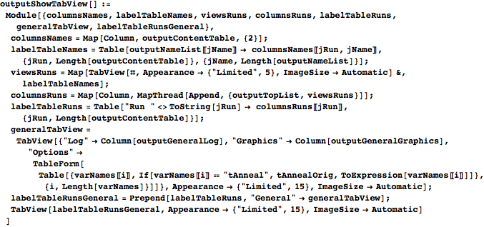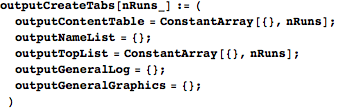 outputCreateTabs creates several list structures (global variables) of the appropriate dimensions to accommodate output from the specified number of runs of PIKA. The output is organized into a TabView, with each run receiving a tab that contains a nested view with graphical and textual output. outputNameList stores the names of the labels in the subview (which are the same for all runs), and outputContentTable stores the output content for each run and sublabel. (Content is stored as a list that later becomes a Column.) Each run’s tab also has a space above its subview for other information, which is stored in outputTopList. Finally, there is another tab on the level of the runs with general textual (outputGeneralLog) and graphical (outputGeneralGraphics) information about the data read in.