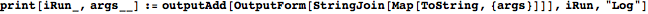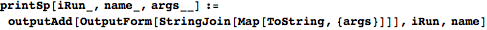 outputAdd adds some expression to the content list for a particular name and run, creating the name’s content list if it has no content already. A run number of 0 indicates output to the general information tab, and a blank name indicates output to the top space of a run’s tab.