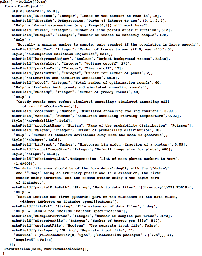 is defined and documented in Section 7.9. After taking input through the form, pika calls runPIKA, the de facto main function for the program, defined in Section 3. You can also specify a separate options file in the form that overrides the variable assignments that the form makes. The first command ensures that the paclet for forms is current.