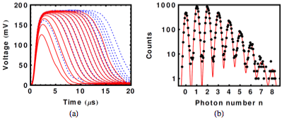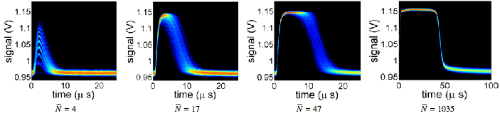 Several groups of TES signal waveforms are shown in Figure 1 (each graph shows the set of signals elicited by an ensemble of laser pulses with an average number of photons per pulse given by