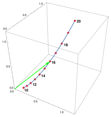 The geometric interpretation of PIKA and the dot product method is a curve and a line, respectively, evolving through hyperspace (shown in Figure 2). The dot product method projects each observation onto the mean waveform vector (a line) and then assumes that photon number scales linearly with distance along the mean vector (which is not actually true, but suffices for a first guess); that converts distance relative to the mean to photon number relative to the mean. PIKA, in contrast, finds a piecewise linear approximation of a curve that passes through the cluster means and projects each observation onto that. Both essentially measure photon number by progress along a one-dimensional path through high-dimensional space.