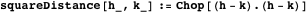 computes the square of the Euclidean distance between two given points. (It is more convenient to use the following definition than the built-in Mathematica function