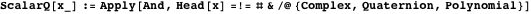 tests if an argument is a scalar in the sense that it is not a complex number, a quaternion number or a polynomial.