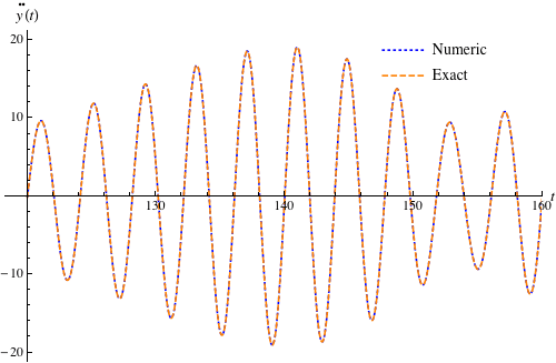 . The advantage of making this change of variable, from the perspective of numerical integration, is the absence of exponential functions of time in the forcing function in equation (8); rather, the forcing function is a constant-frequency sine wave, and the coefficients in the equation are at most quadratic in