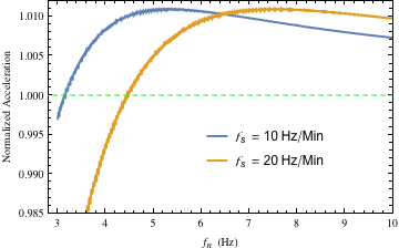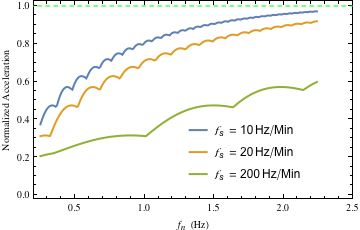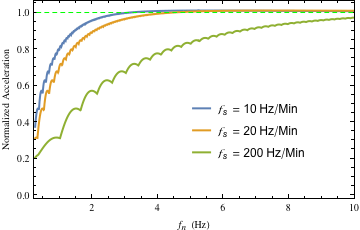 Figures 15 and 16 show the severe attenuation that occurs when the start frequency of the sweep is close to the natural frequency. In both figures, the sweeps were started at 1 Hz. As can be ascertained, the attenuation is significant for systems with natural frequencies close to or below 1 Hz, as would be expected. Hence, the attenuation is not only a function of the natural frequency, damping and sweep rate, but also of the proximity of the start frequency of the sweep to the natural frequency. As with Figure 11, each of the peak response values on each of the curves in Figures 14–16 was computed via the process for computing peak acceleration (from the exact solution) described in Sections 7 and 8.