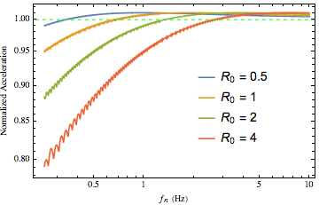 Figure 11 shows the normalized peak response to various octave sweep rates. Each of the (almost 1,000) peak response values on each of these curves was computed via the process for computing peak acceleration (from the exact solution) described in Sections 7 and 8, that is, searching within ±60 cycles of the numerically generated estimate of when the peak acceleration occurs, with 1,440 phase increments per cycle. As expected, the slower the sweep rate, the lower the attenuation. In addition, the scalloped behavior in the peak response curves that was observed for the linear sweeps is also present here, although not as pronounced. This is because the octave sweep increases in frequency more rapidly than the linear sweep.