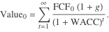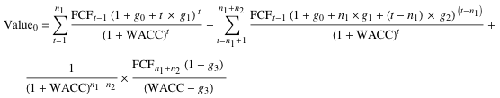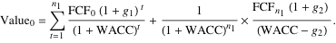 One of the most widely used business valuation models is the discounted cash flow model, in which the value of any asset is obtained by discounting the expected cash flows on that asset at a rate that reflects its riskiness. In its most general form, the value of a company is the present value of the expected free cash flows the company can generate in perpetuity. Because we cannot estimate free cash flows (FCF) in perpetuity, we generally allow for a period where FCF can grow at extraordinary rates, but we allow for closure in the model by assuming that the growth rate will decline to a stable rate that can be sustained forever at some point in the future. If we assume that the discount rate is the weighted average cost of capital (WACC), FCF grows at the rate of