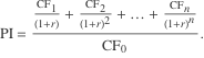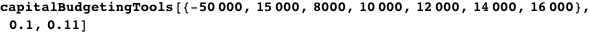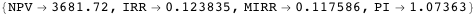 function with an example. Say a project requires a $50,000 initial investment and is expected to produce, after tax, a cash flow of $15,000, $8,000, $10,000, $12,000, $14,000 and $16,000 over the next six years. The discount rate is 10% and the reinvestment rate is 11%. We compute the project’s NPV, IRR, MIRR and PI.