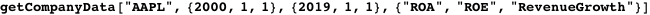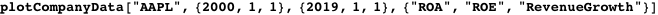 We download Apple’s return on assets (ROA), return on equity (ROE) and revenue growth over the period January 1, 2001, to January 1, 2019, and plot them.